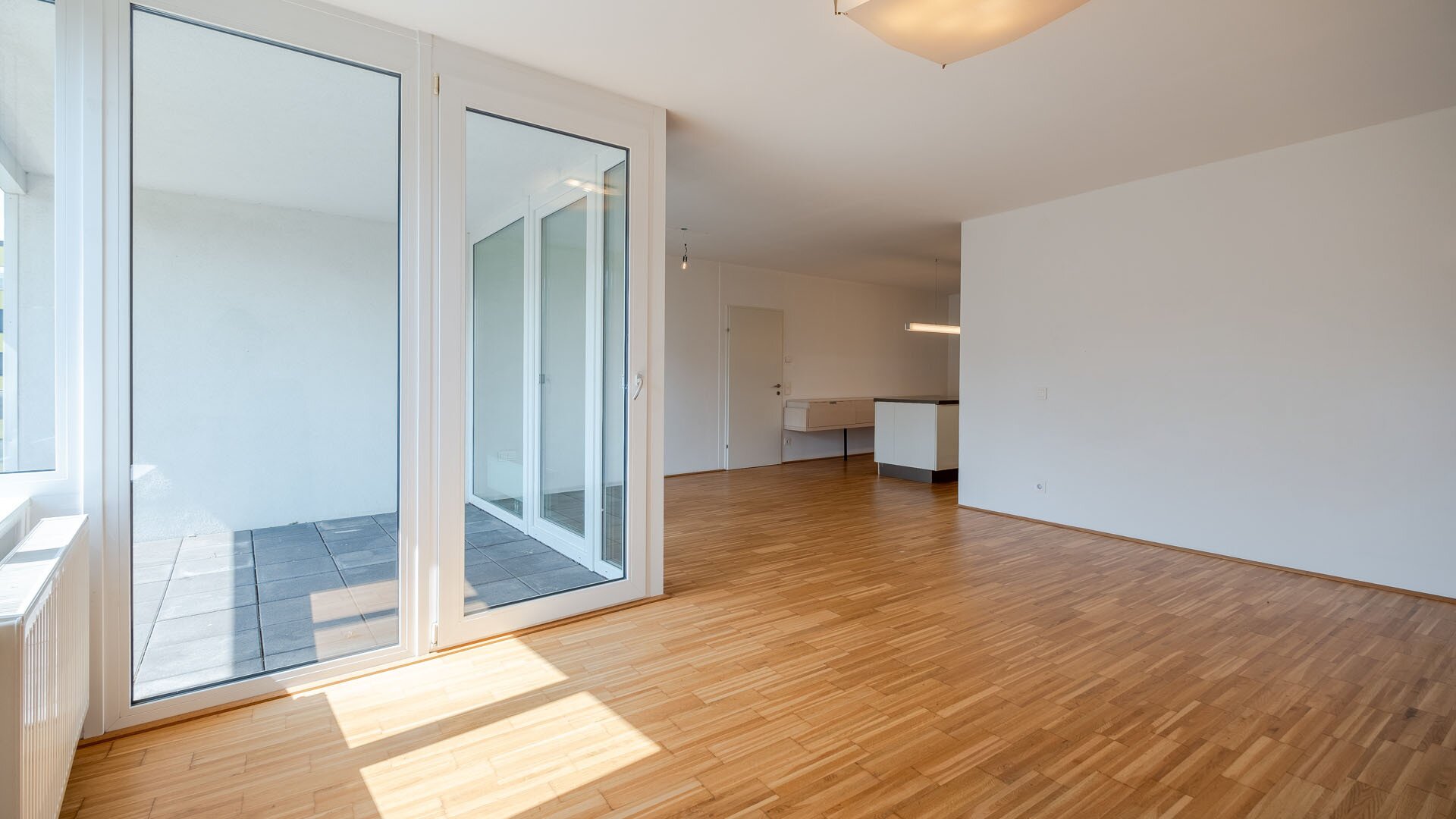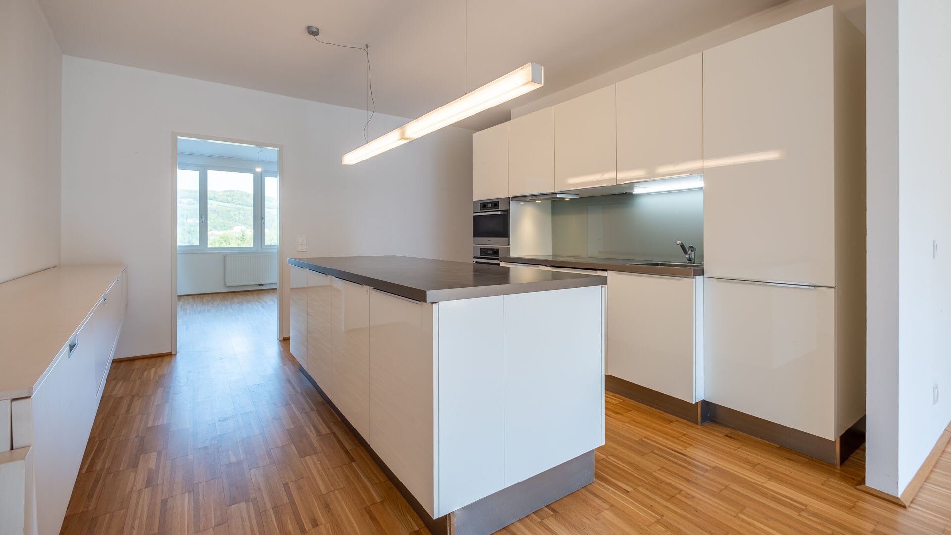 Das Herzstück dieser Wohnung ist zweifellos der großzügige Wohn-Essbereich. Hier erleben Sie ein helles und offenes Ambiente, das zum gemütlichen Beisammensein einlädt. Besonders hervorzuheben ist die moderne Küche, ausgestattet mit hochwertigen Geräten, die das Kochen zu einem Vergnügen macht. Ein zusätzlicher Abstellraum sorgt für genügend Stauraum. Vom Wohnzimmer aus gelangen Sie auf die südlich ausgerichtete Loggia, die sich als perfekter Rückzugsort im Freien präsentiert.