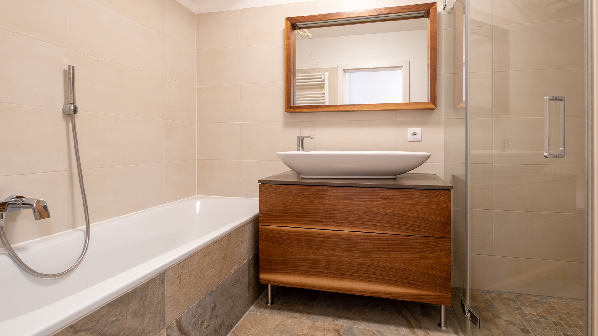 Nebst Schlafzimmer und Kinderzimmer, die durch ihre großen Fenster lichtdurchflutet werden, findet man auch ein wunderschönes Badezimmer mit Badewanne und Dusche sowie ein getrenntes WC.
