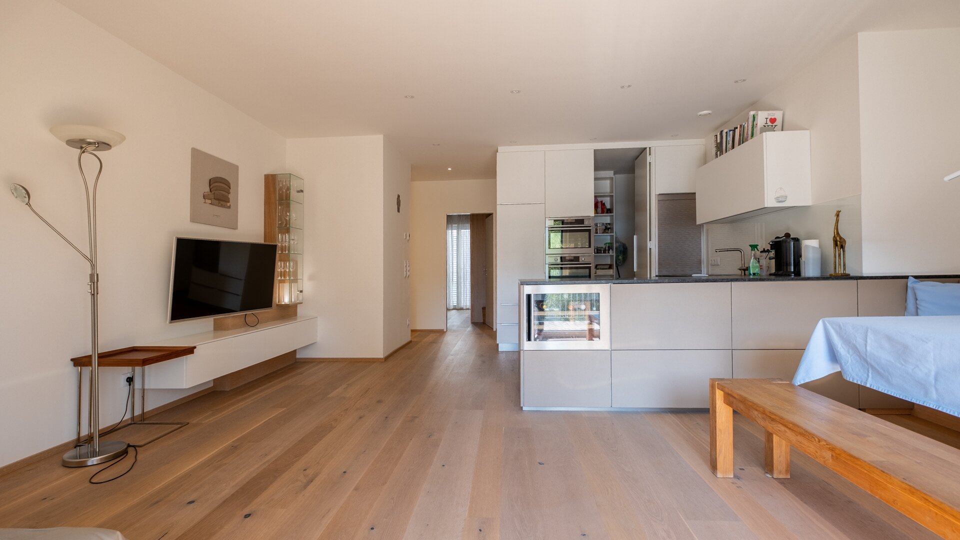Des weiteren findet man einen sonnigen Wohn- Essbereich mit Zugang zur westseitigen Terrasse der sich als Herzstück der Immobilie herauskristallisiert und welcher über eine exklusiv ausgestattete Einbauküche mit extra Stauraum verfügt.