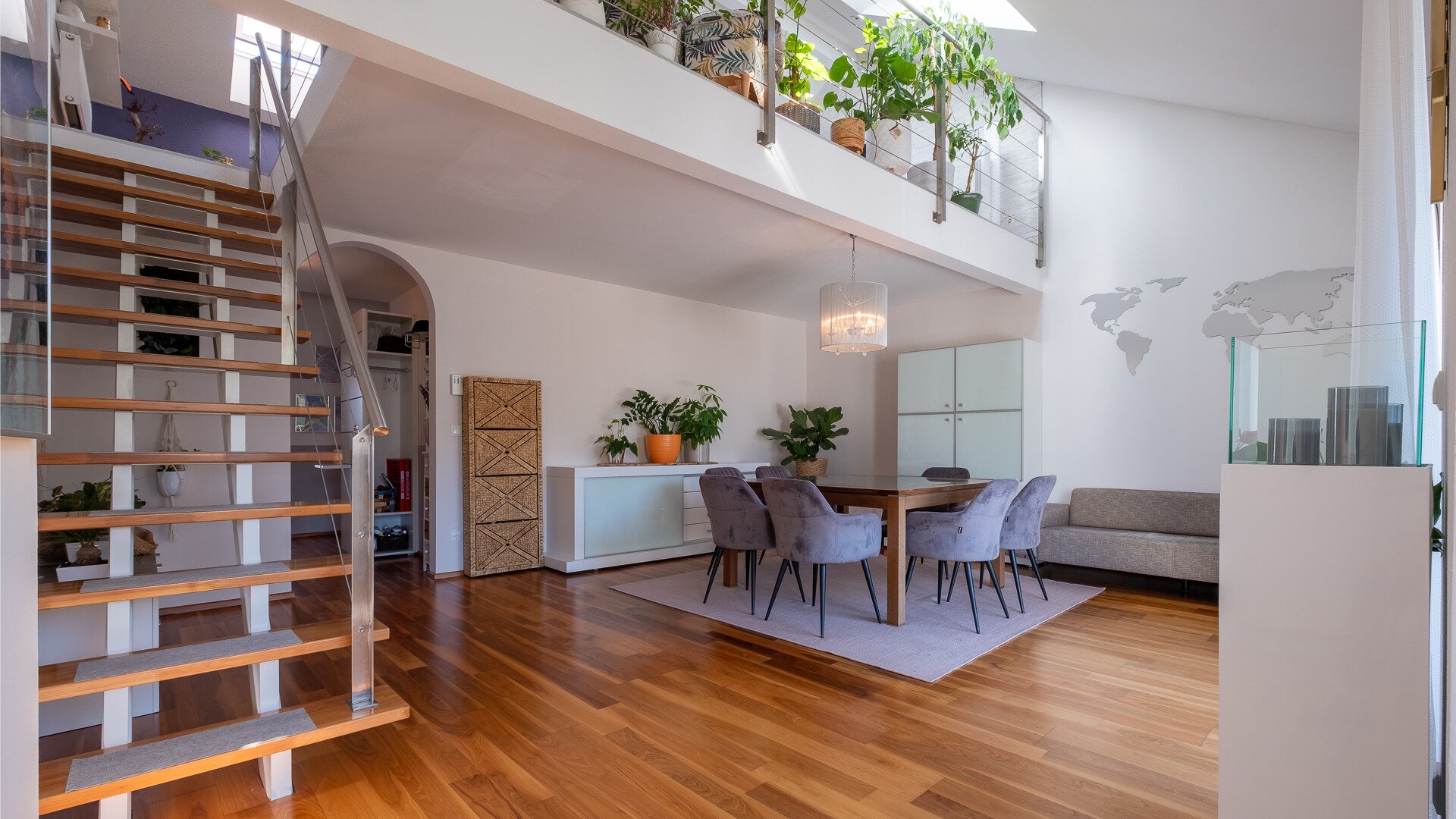 Beim Betreten tauchen Sie in das wohlige Ambiente ein. Der großflächige Bereich fürs Kochen und Essen lädt zum Verweilen ein. Von diesem Areal blicken Sie nicht nur in die tolle Umgebung, sondern hier erreichen Sie auch die angrenzende Terrasse, die den Wohnraum verlängert. Das Wohnzimmer (Galerie) erreichen Sie über eine Treppe. Die heimelige Galerie dient als idealer Rückzugsort und offeriert eine einmalige Privatsphäre.
