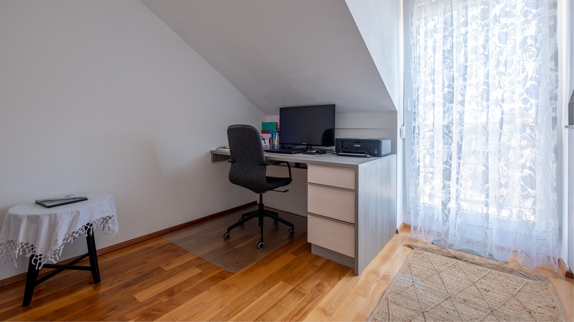 In der unteren Ebene befindet sich der Elternschlafraum. Das Kinderzimmer oder Büro (je nach Ausgestaltungsform) mit eigenem Balkon ist ebenfalls hier untergebracht. Diese Ebene verfügt auch über ein gut durchdachtes Badezimmer samt Dusche und Badewanne (ein Platz für die Waschmaschine/Trockner ist gegeben). Zusätzlich sind auf dieser Wohnebene eine Toilette sowie ein Abstellraum untergebracht.