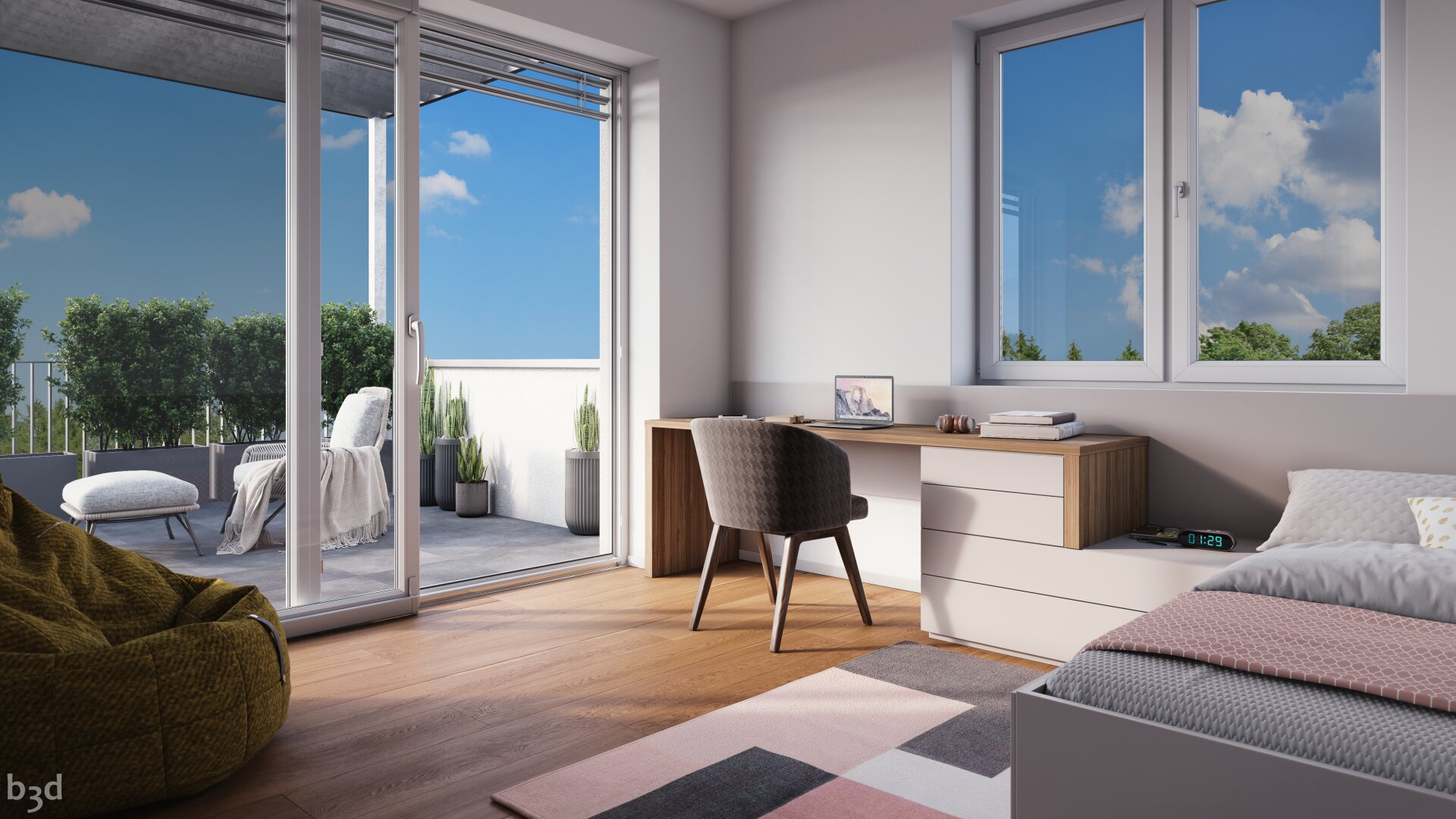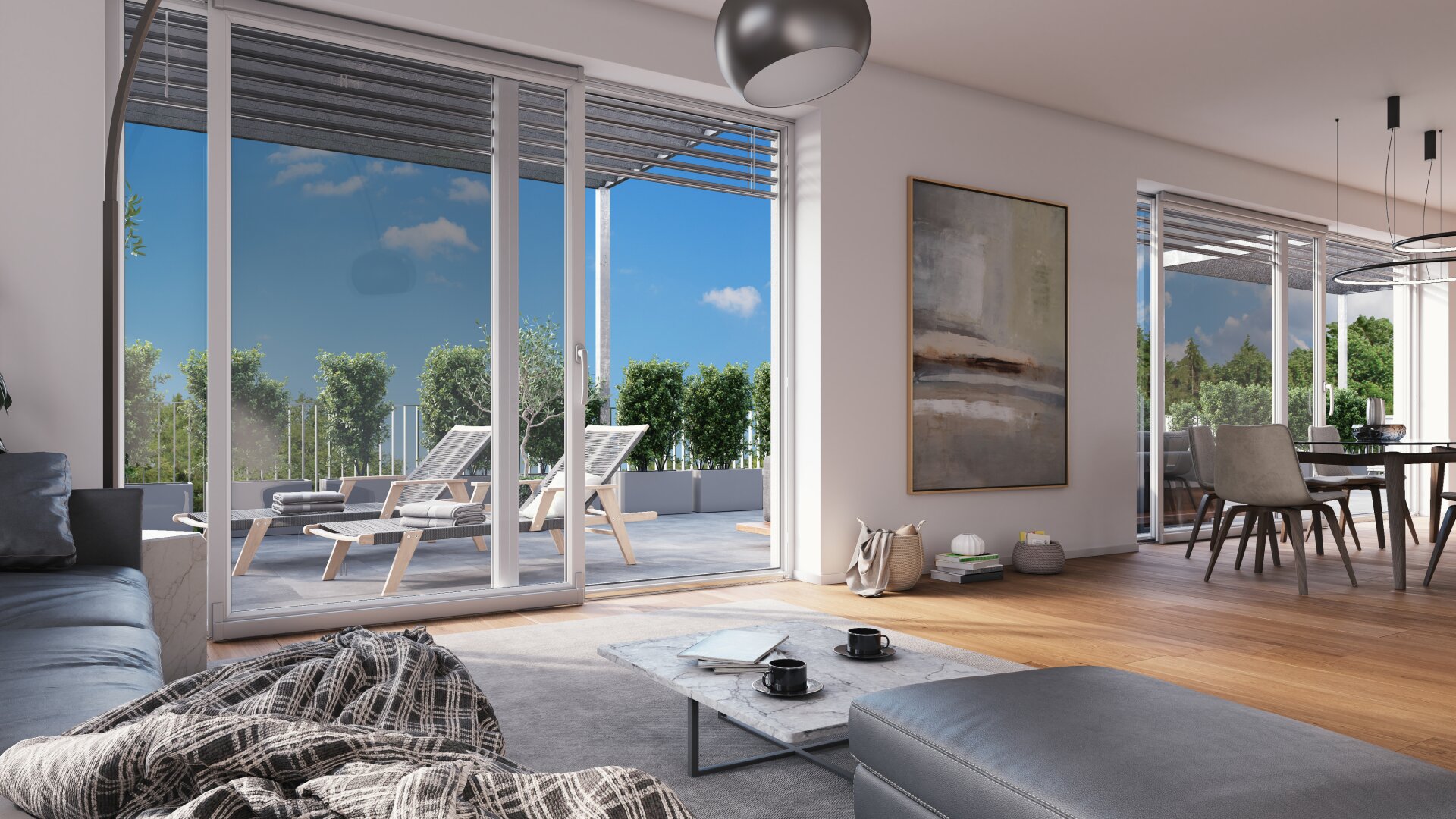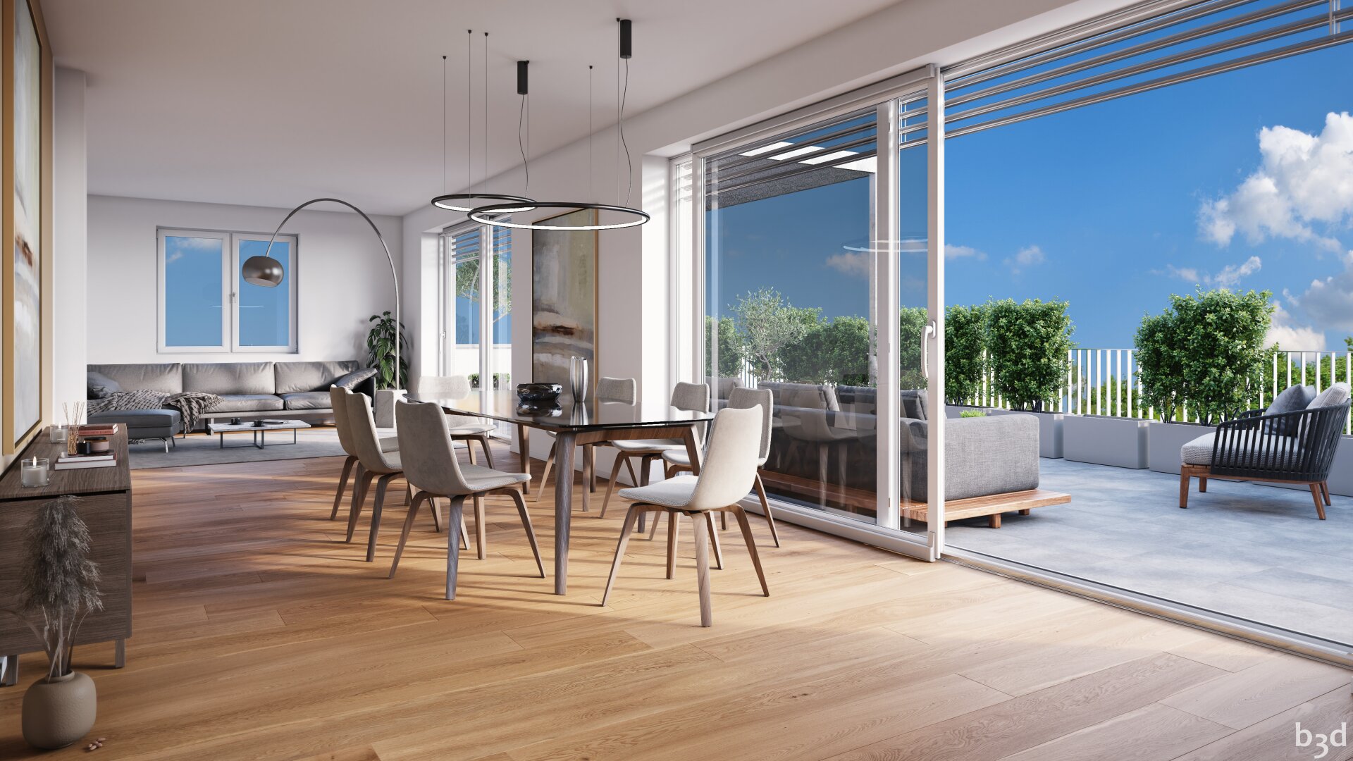 Das barrierefreie Penthouse ist durch einen Lift von der Garage bequem erreichbar. Vom Foyer ist beinahe jedes Zimmer begehbar, außer der Elternbereich mit eigenem Badezimmer, der sich separiert in einem eigenen Teil der Wohnung befindet.