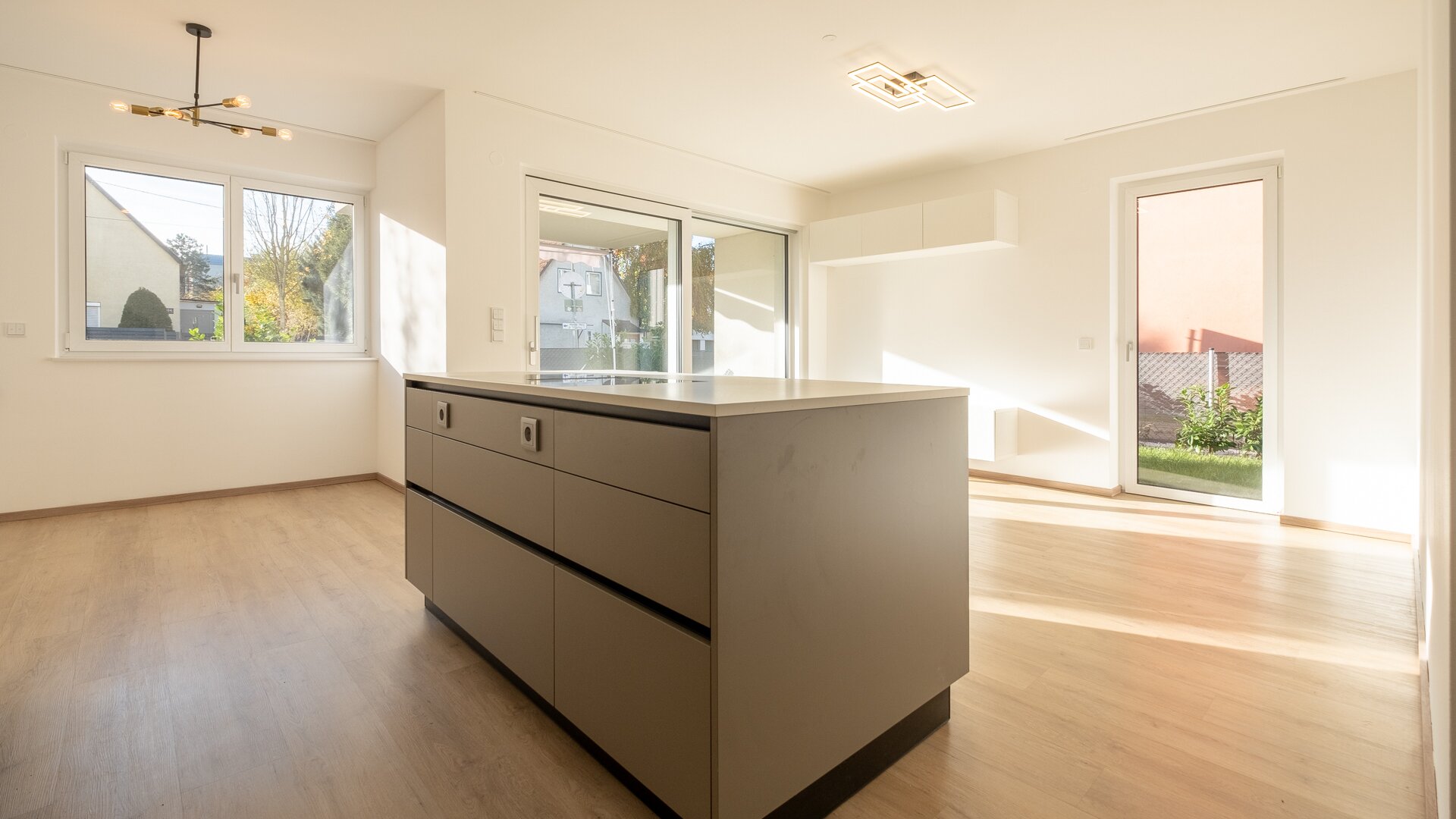 Das Herzstück der Wohnung ist das helle Wohn-Esszimmer mit großer Fensterfront und direktem Zugang zum Garten. Hier befindet sich eine hochwertige Einbauküche mit integrierter Kücheninsel – voll ausgestattet mit sämtlichen Geräten und optimal auf moderne Wohnbedürfnisse ausgelegt. Der Wohn-Essbereich bietet genügend Raum für gemeinsames Kochen, Essen und Entspannen.