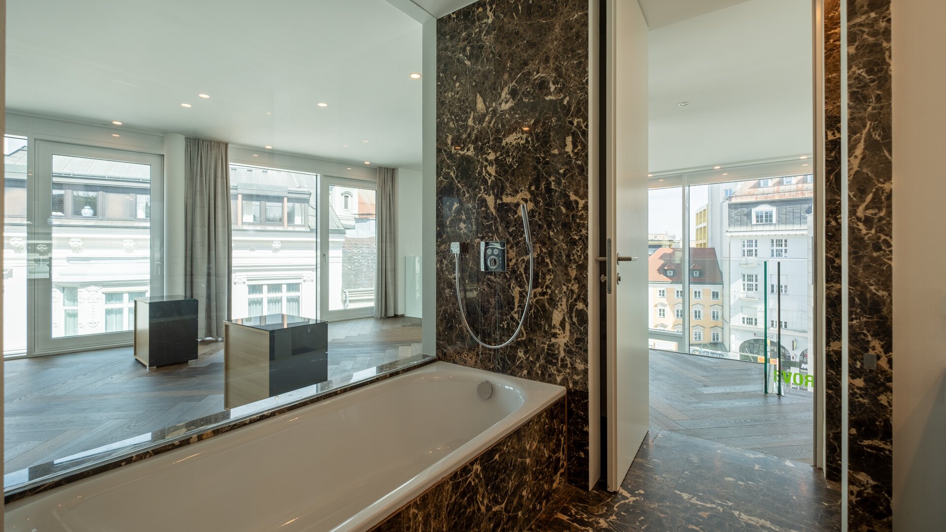 Das Obergeschoss empfängt Sie mit einem großzügigen Schlafzimmer, das durch seine raumhohen Fensterflächen beeindruckt. Großzügige Glasfronten schaffen ein einzigartiges Raumgefühl und lassen den Blick über die Dächer und Fassaden der Linzer Innenstadt schweifen. Durch den Lichteinfall wirkt der Raum ganztägig hell und offen – eine perfekte Kombination aus Urbanität und Rückzugsort. Das Badezimmer überzeugt mit einer Ausstattung aus Dusche, Badewanne und Natursteinelementen.