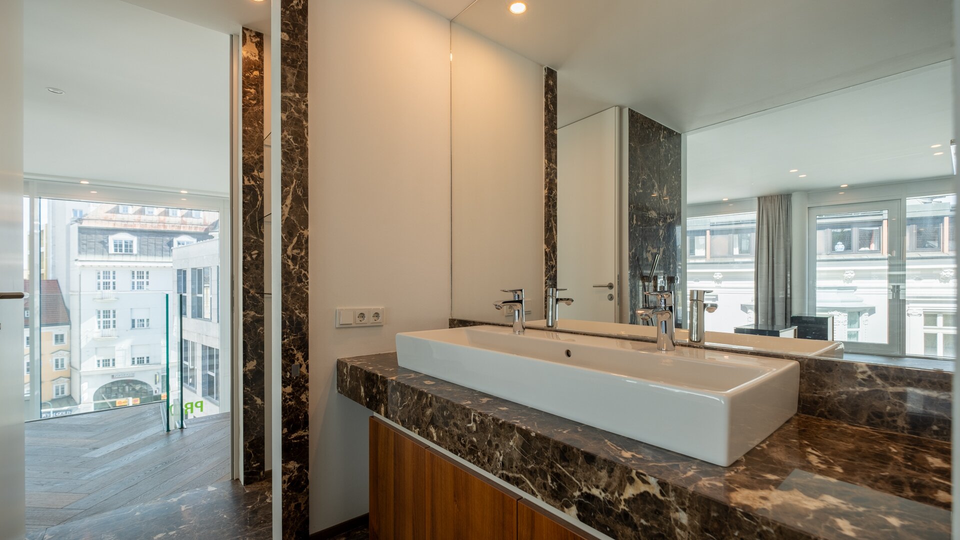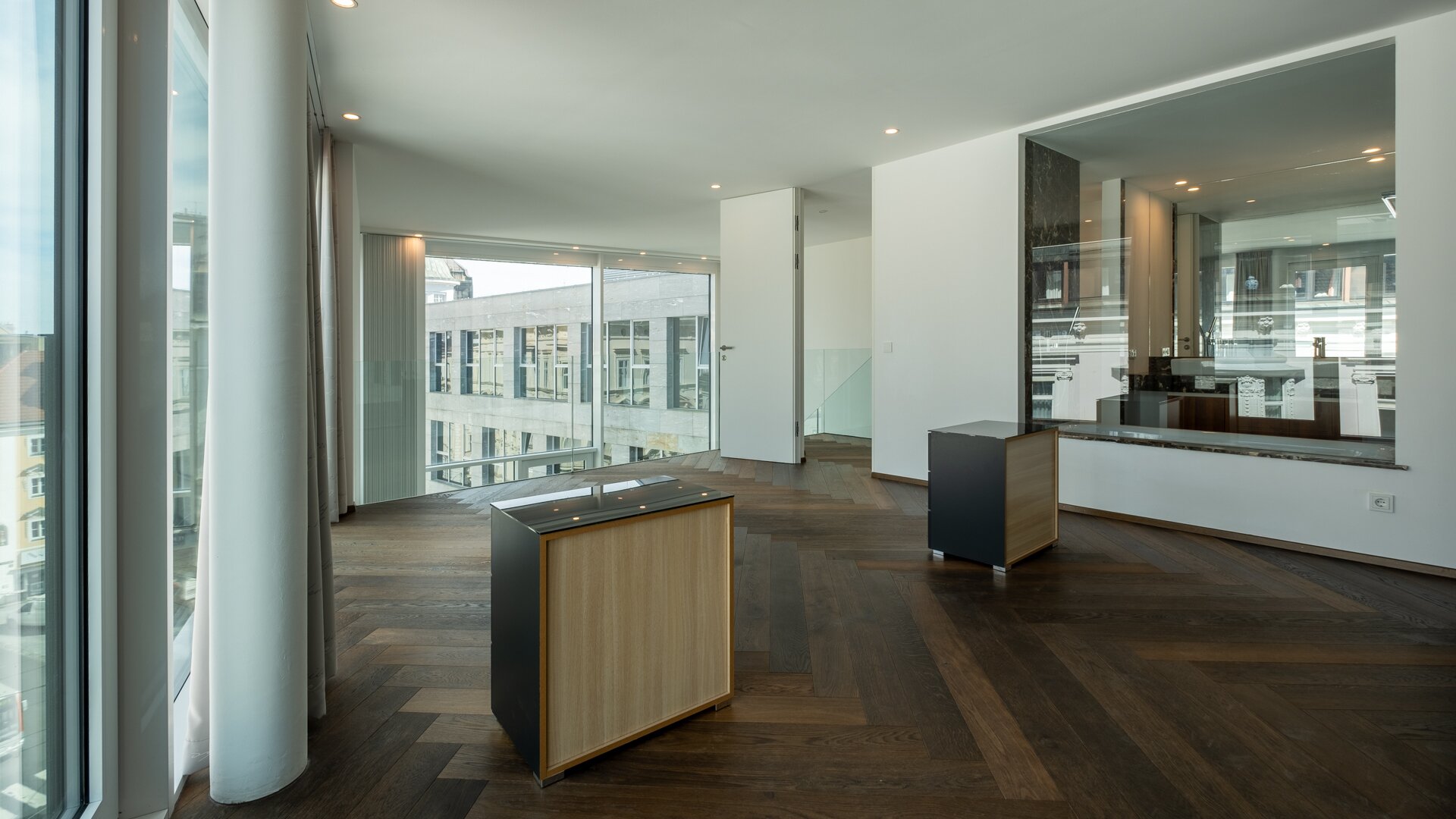 Die großzügige Dachterrasse bietet Raum für Entspannung oder repräsentative Anlässe. Ein Loungebereich, eine Sonneninsel sowie ein kleiner Teich mit Goldfischen schaffen eine einzigartige Atmosphäre über den Dächern der Stadt.