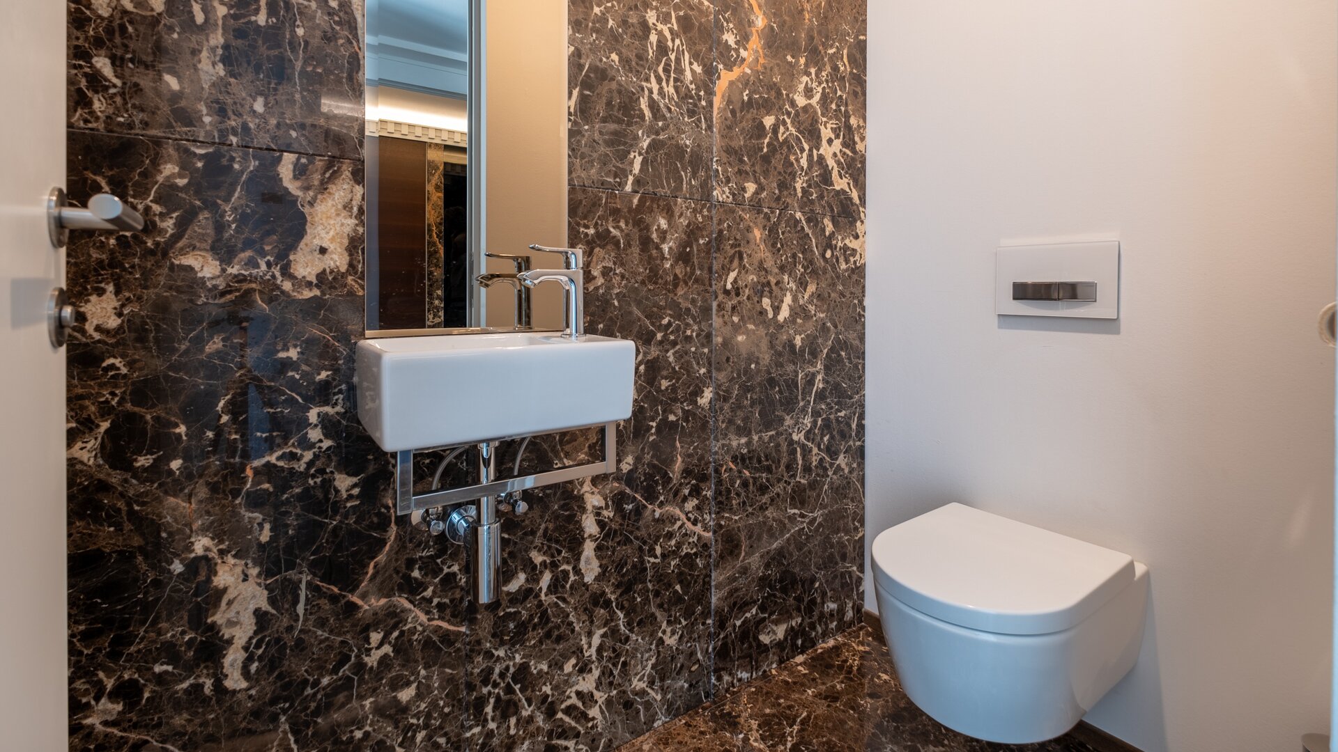 Ein stilvolles Gäste-WC mit Naturstein, sowie ein Kamin, der Wärme und Atmosphäre schafft, runden dieses Geschoss ab. Ein separaten Raum, der sich perfekt als Schlafzimmer oder ruhiges Büro eignet, befindet sich auch noch im Erdgeschoss.