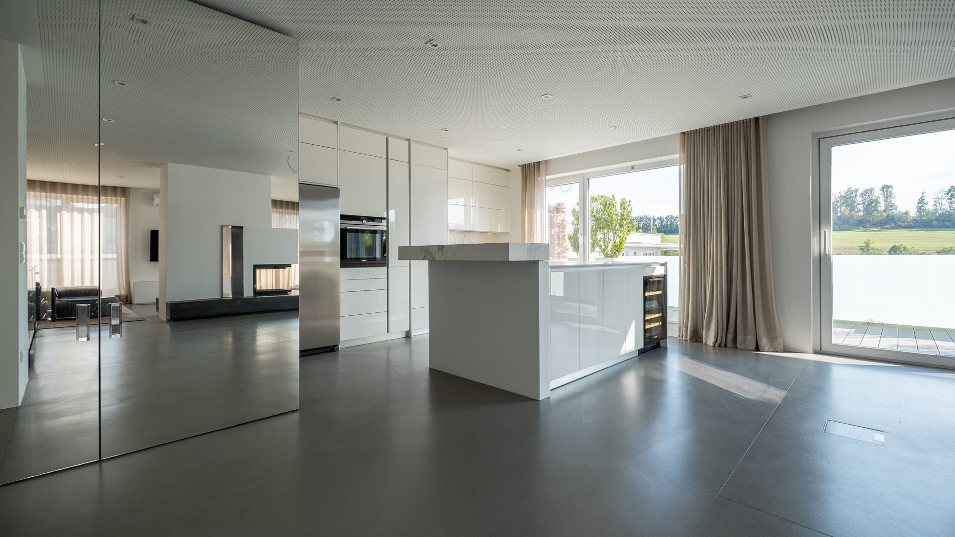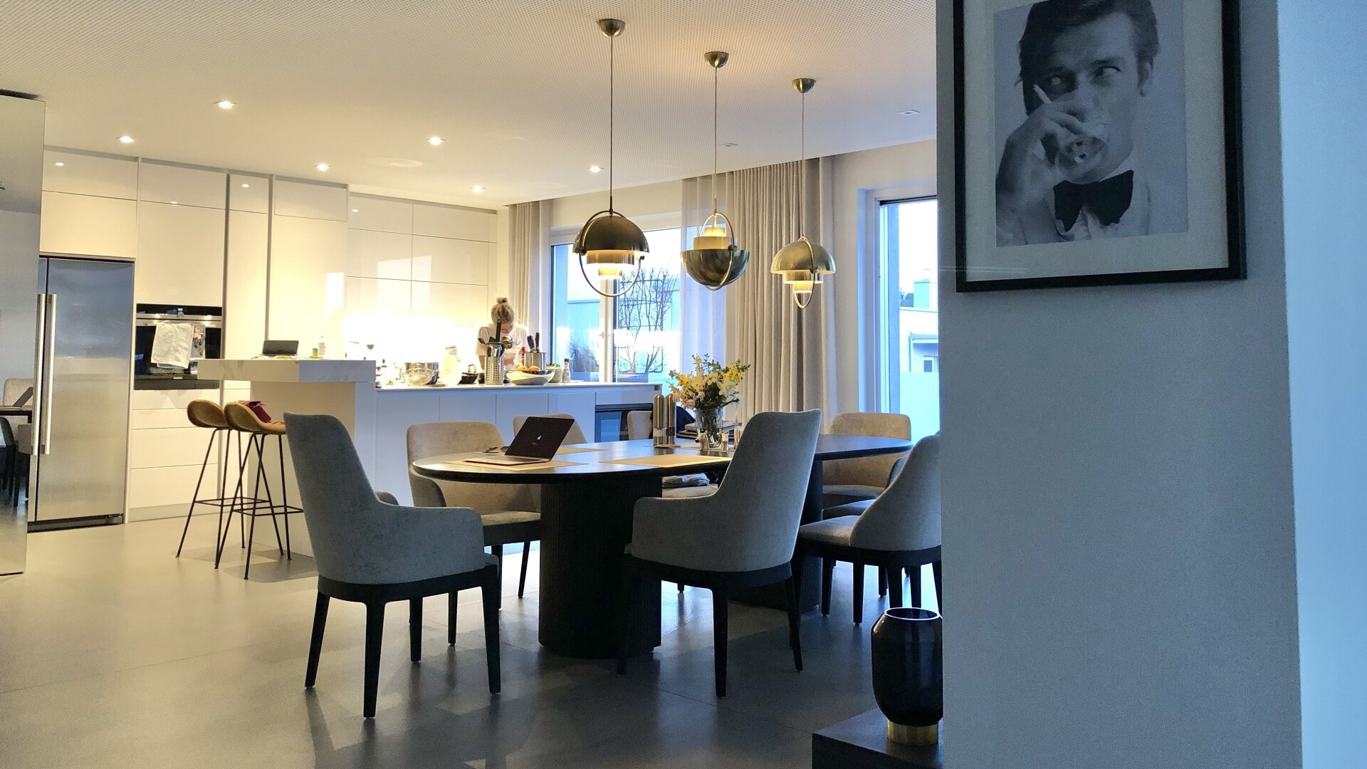 Angefangen bei der modernen Tischlerküche aus Keramik bis hin zum Pandomo-Boden erkennt man direkt auf den ersten Blick, die durchdachte Planung und Ausführung dieser Dachgeschosswohnung.