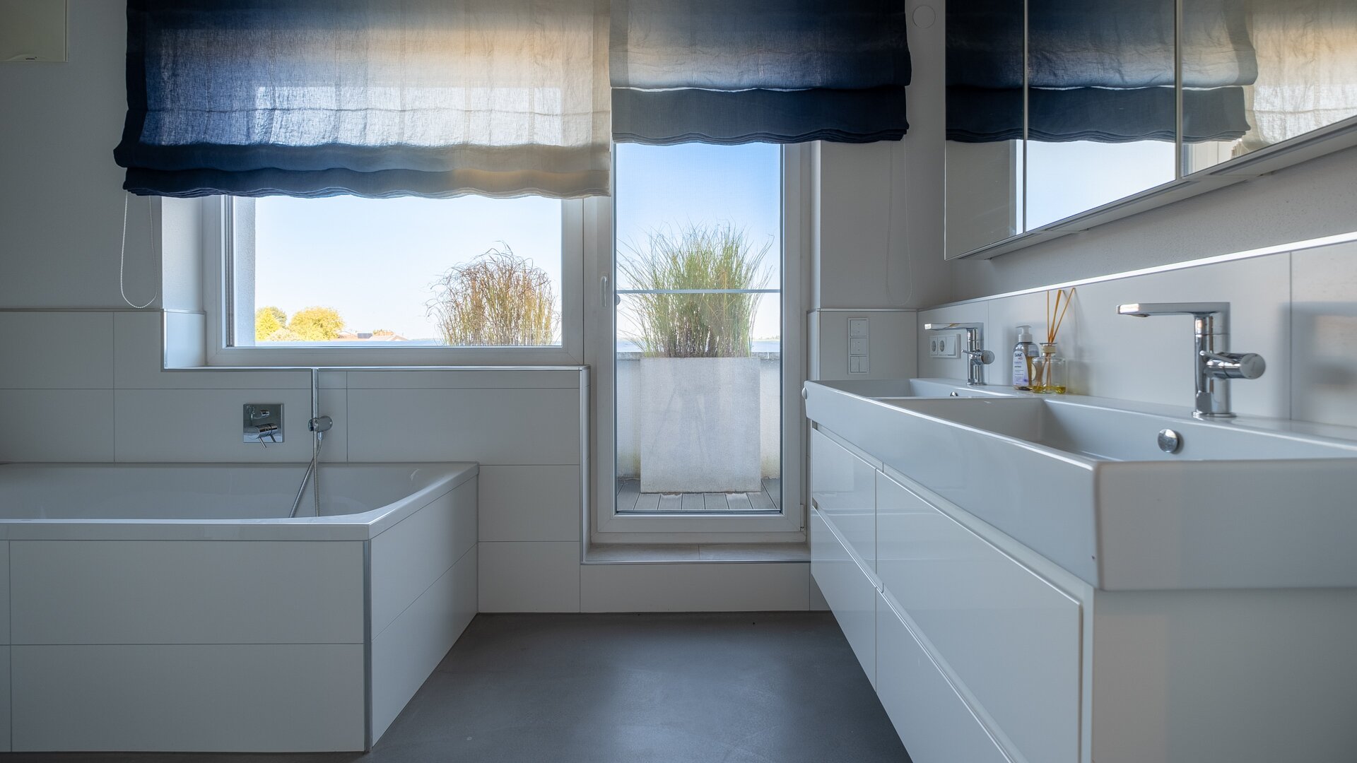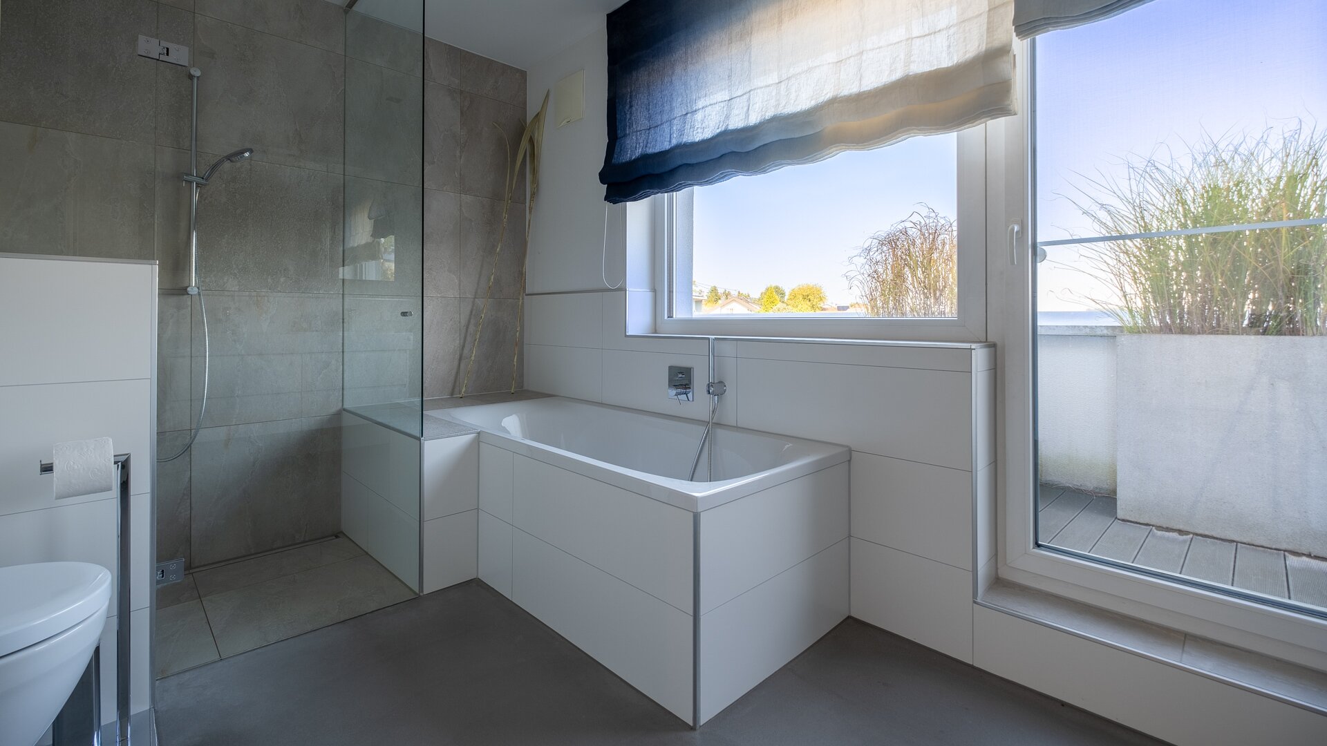 Auch das Badezimmer überzeugt durch den lichtdurchfluten Eindruck sowie durch den Zugang auf die Terrasse.