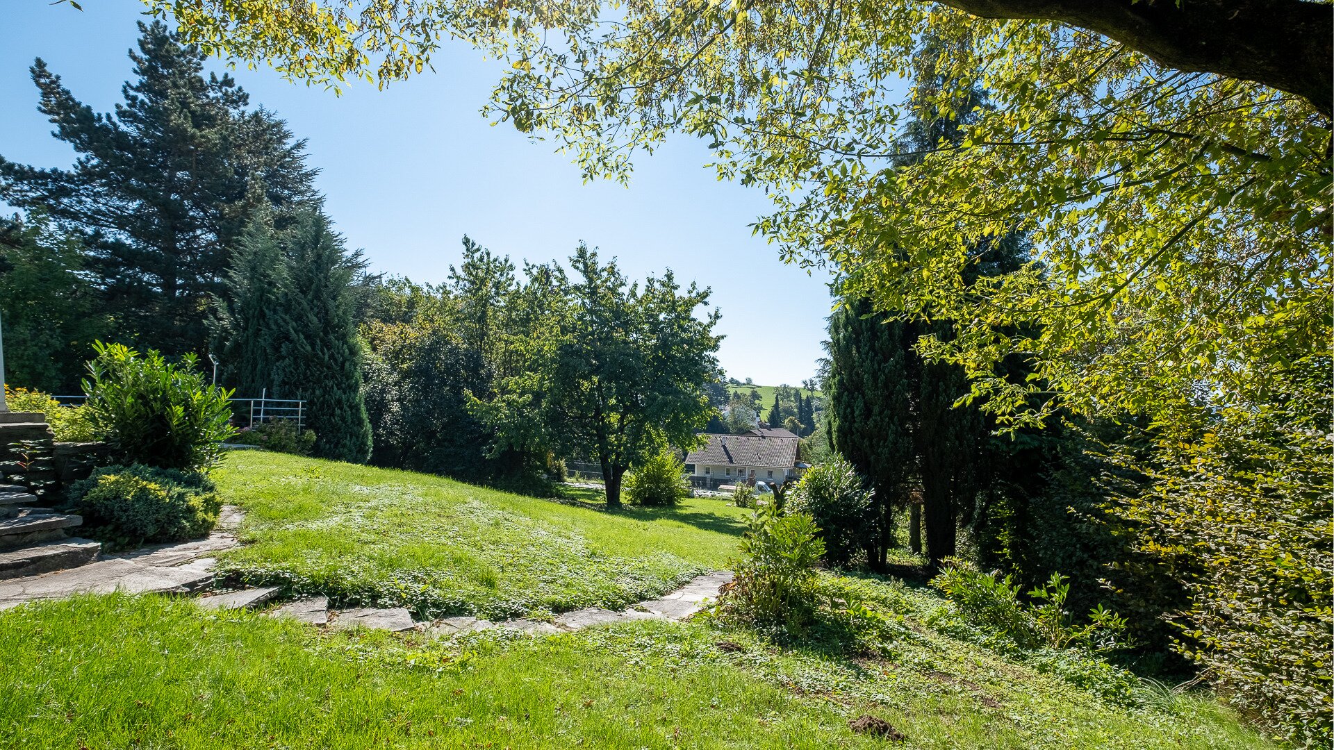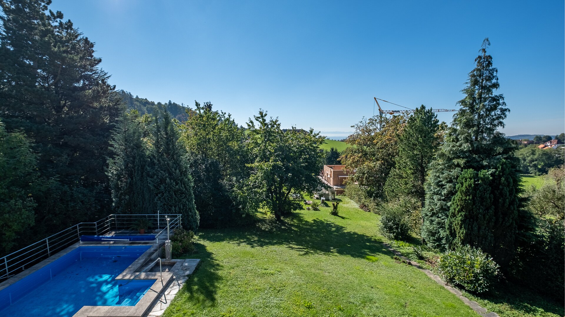 Neben einer tollen Lichtstimmung ist vor allem in den oberen Etagen ein toller Fernblick auf die Alpen gegeben. Die südseitige Ausrichtung sorgt für eine perfekte Lichtstimmung im Objekt bzw. im großzügigen Garten. Ein Swimmingpool ist ebenfalls vorhanden. Auf Grund der Grundstücksgröße kann dieses bei Bedarf auch geteilt werden.