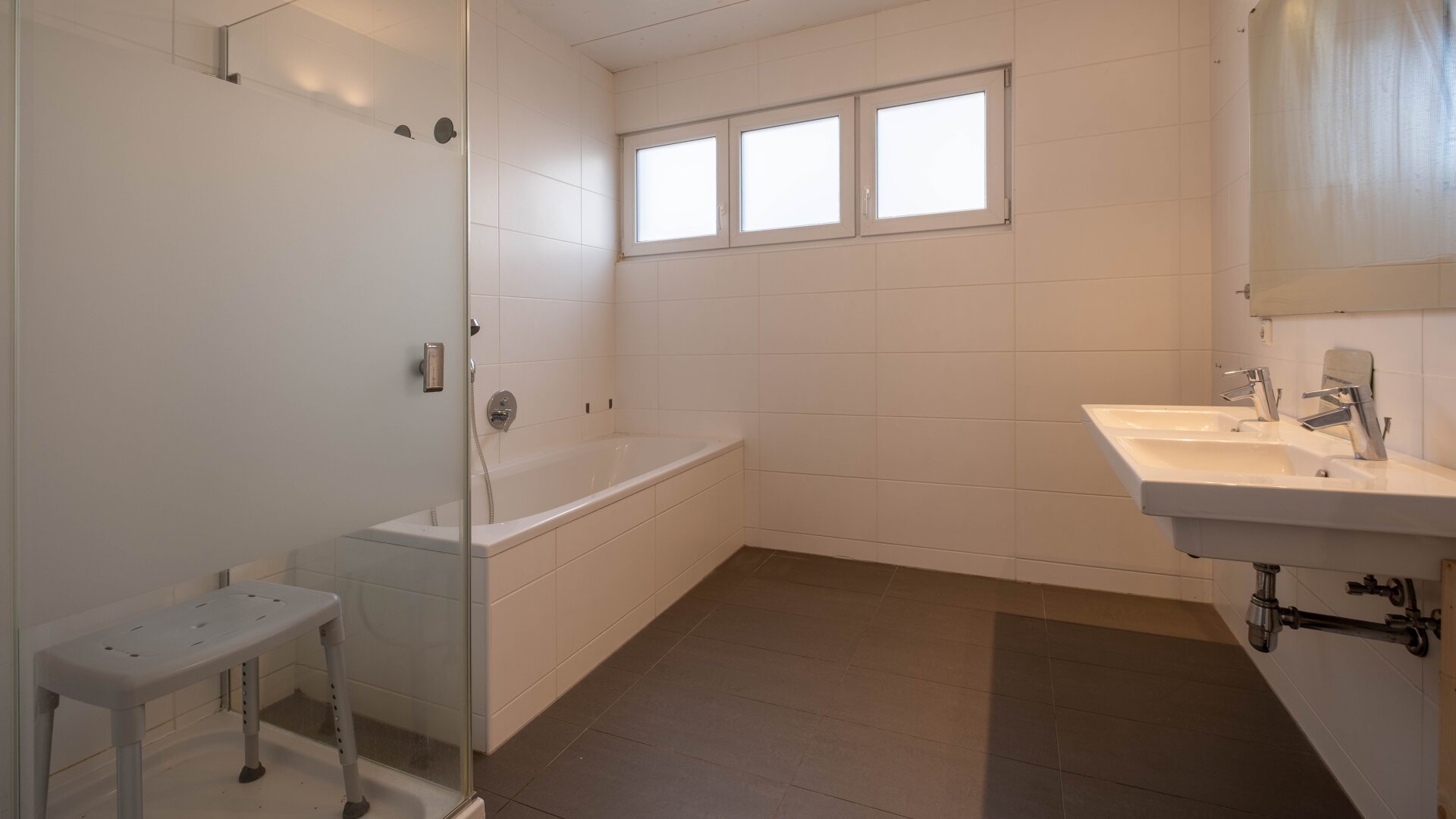 Das Badezimmer ist mit Dusche und Badewanne ausgestattet und verfügt über ein Fenster, das für angenehmes Tageslicht und gute Belüftung sorgt. Die Toilette ist separat, was den Wohnkomfort zusätzlich erhöht.