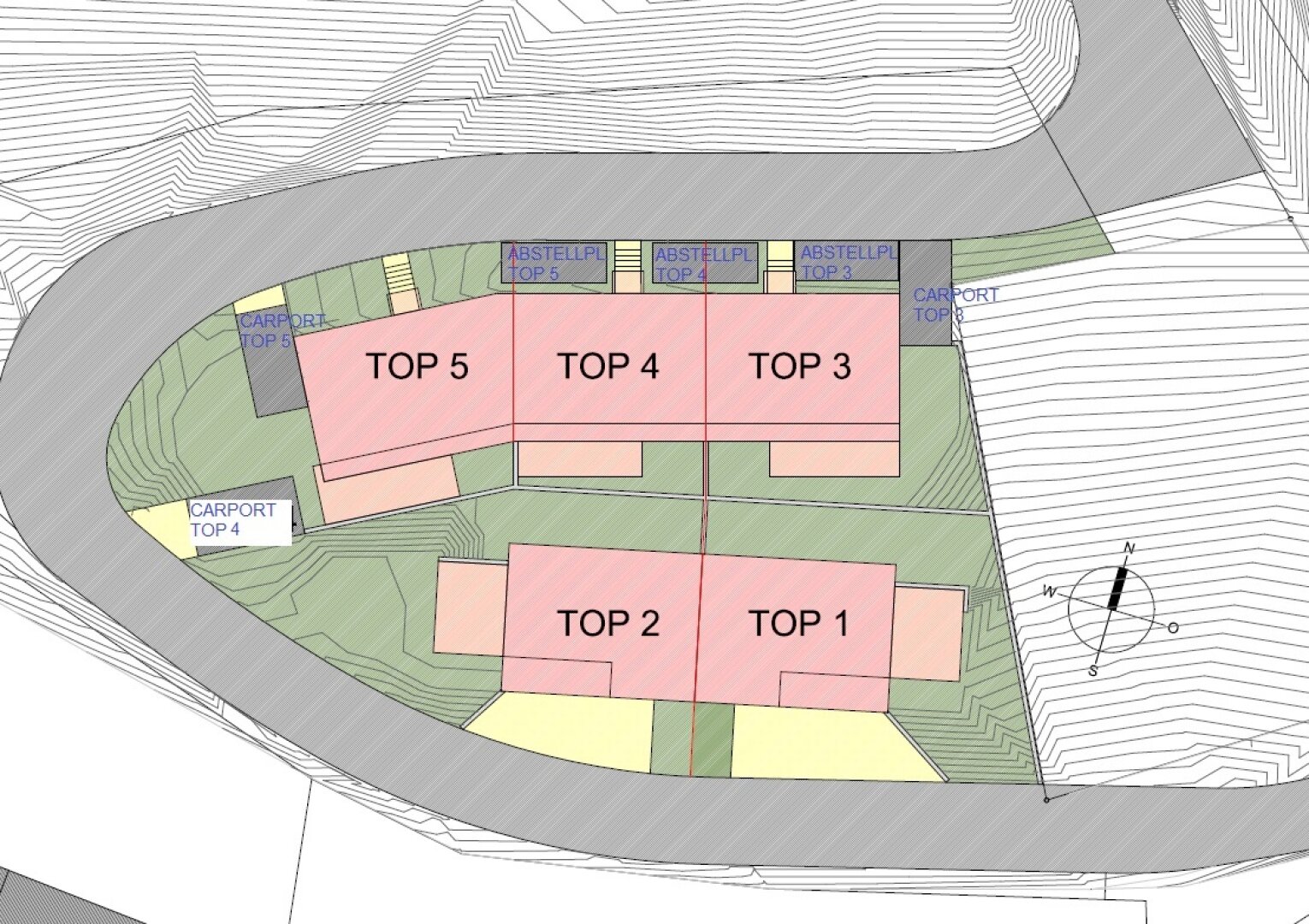 Jede Einheit beinhaltet entweder einen Garagenplatz oder ein Carport sowie einen zusätzlichen PKW-Abstellplatz oder Doppelgarage bei den XXL Varianten mit mehreren Stellplätzen und zwei Terrassen auf größeren Parzellen.